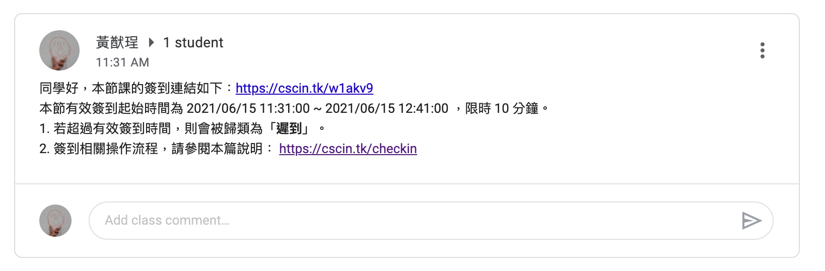 老師在上課前會將「簽到連結」張貼在 Google Classroom 公告。