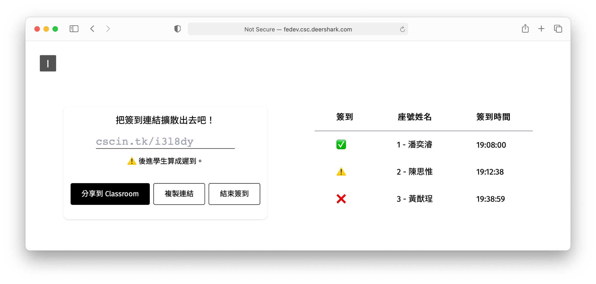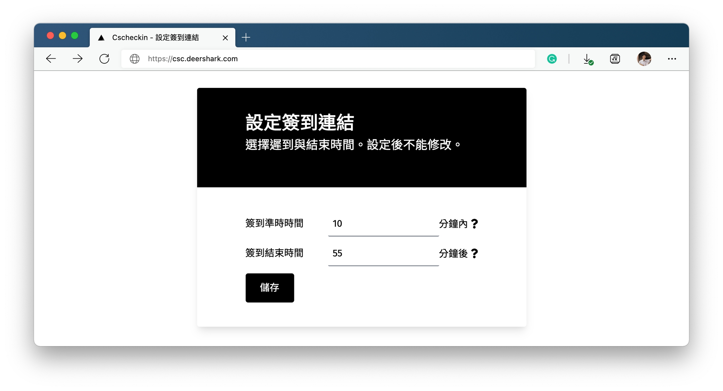 注意:目前 v1.0 版預設準時簽到時間為 10 分鐘;簽到結束時間為 50 分鐘。